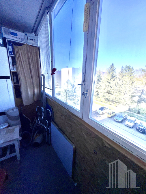 A kisebbik szoba beépített erkélyes, keleti tájolású, parkra, zöld környezetre néz.